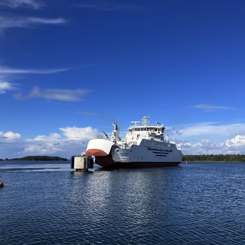 Ålandstrafiken kör ordinarie bussar till färjan i Svinö. Ni köper biljett på bussen. Linje 5 går till och från färjan i Svinö.